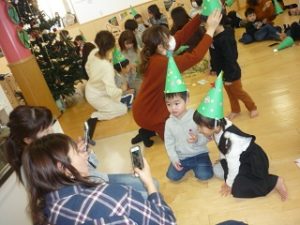 12月18日(水)ちょっぴり早いクリスマス会が行われました。いつもと違う飾りつけをした支援センターホールの雰囲気や、サンタ帽子をかぶった先生達の姿に緊張した様子の子ども達。それ以上に緊張している2人の先生。大好きな「水中めがね」の手遊びでいつもの(?)調子を取り戻し、ハンドベル演奏で会の始まりです。「赤鼻のトナカイ」のペープサートでは、ママ達も一緒に大合唱。少しずつクリスマス感ただよう中、三角帽子を作りました。今年はツリー仕様の帽子で、みんな可愛らしく出来上がっていましたね。出来上がった帽子をかぶってサンサン体操を踊っていると・・・後方からアンパンマンが・・・???!!!・・・子ども達の反応は・・・???。1人ずつプレゼントを手渡してもらいお膝の上で「はい、パチリ」 来年も来てくれるかな?まってまぁす!!子ども達の後はママ達の出番。あっちむいてホイ大会やじゃんけん大会で大盛り上がり。喜んだり残念がったり。子育て真っ只中のママ達にささやかでしたが楽しんでいただけたなら嬉しいです。次は「せつぶんごっこ」です。誰が遊びに来てくれるかな?