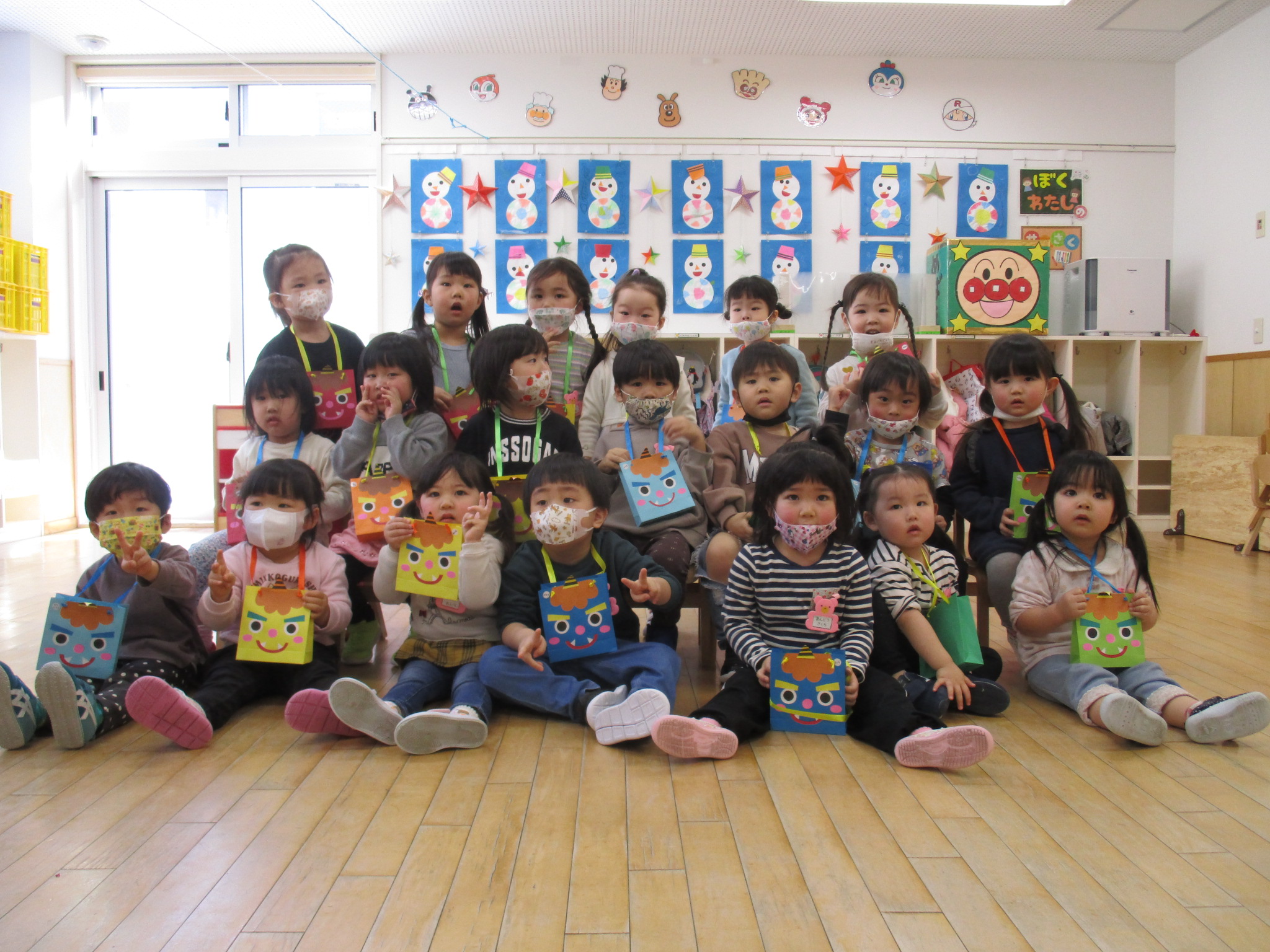 2月9日、ちょっと遅れて「豆まき」をしました。心の中の「泣き虫鬼」「いじわる鬼」「おこりんぼ鬼」を退治しよう!ドキドキしながら待っていると・・・「ドンドン」と戸をたたく音が・・・カーテンを開けると赤鬼の姿が‼「おにはそと!」と立ち向かう勇気のある子、ただただ怖くて泣きだす子。みんなで無事に鬼を退治して 鬼は山に帰っていきました。その後は鬼からのプレゼントをもらって大喜び(o^―^o)ニコ お部屋ではもう一回 鬼のパネルに玉をぶつけて遊ぶゲームをしました。ちょっと怖かったけど楽しい「節分」になりました🎵