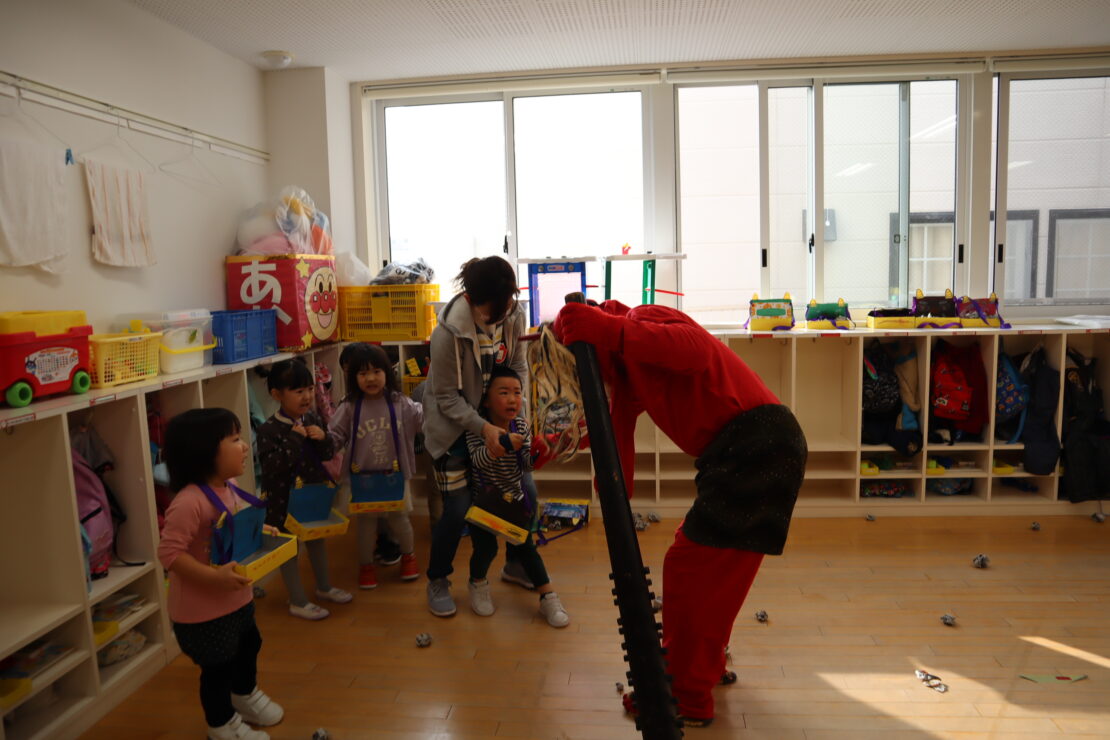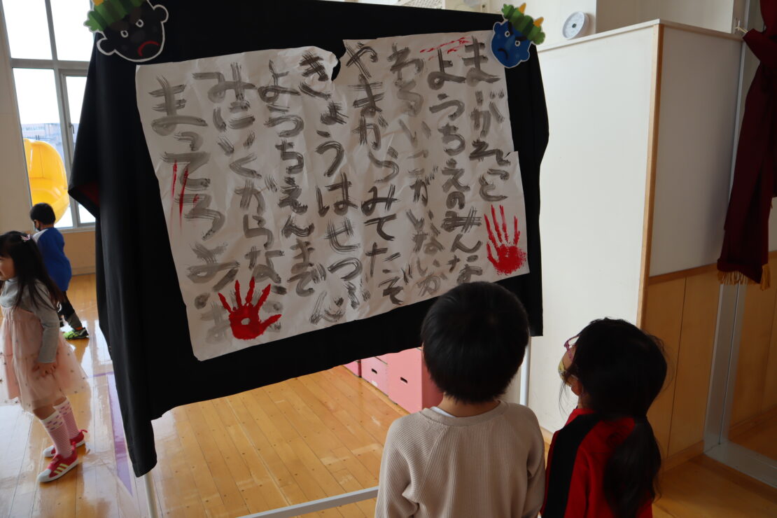 2月2日(火)節分(まめまき)を行いました。突然届いた鬼👹からの手紙にザワザワ・・・手形がリアルだったのか「爪がすごいね・・」「手紙もやぶれてるよ・・」 今年は、効果音も使って演出に力を入れてみました。例年は体育館で行いますが、コロナ感染対策の為 各クラスに鬼が乱入👹 狭い!! 逃げる場所がな~い・・・悲鳴や鳴き声が響き渡りました。さっきまで「鬼はせんせいたちかバスの運転手さんでしょ!こわくないよ~」と言っていた子も必死で逃げまわっていたり、昨日から「おに くる?」と何度も聞いていた子が必死に豆をぶつけていたり・・・ おにもコロナにかかって来ないかも・・と期待していた子もいましたよ。