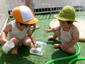 りす・うさぎ・ぱんだ組 全員で毎日、水遊びを楽しんでいます(^∀^)/♬✧ 今日は、大きな氷を作ってくれた先生がいて 大人気に!! 『つめた~い』『これは、なんだろう…』『水をかけてみよう!』『ビックリして手がシュッとかくれたり』『穴があいたところを見つけて研究』 子どもたちが【氷】との出会いに、それぞれに刺激をもらった瞬間でした。 水遊びの準備が始まると、早く遊びたくて入口に引き寄せられるように集まったり、お片づけが始まると まだ遊びた~い!と逃げて行っちゃったり。 【楽しいこと】への、期待がいっぱいに ふくらんで 夏を楽しんでいます♬