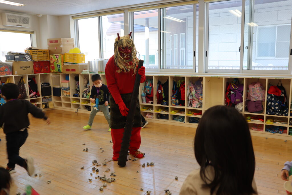 令和4年2月9日(水)、3日に予定していた「節分」が延期され9日無事行う事が出来ました👹 7日の朝 鬼からのお手紙が届き こども達はただならぬ気配を瞬時に感じ取り・・・この日から「良い子♡」が増えたような…(o^―^o)ニコ 黒鬼と赤鬼の訪問に各お部屋からは 叫び声と泣き声と「鬼は外!」が入り交じり 果敢に向かっていく子や必死に先生の後ろにしがみついている子、ピアノの裏に隠れていた子(七ひきの子ヤギ⁈)年に一度の壮絶な光景が‼ 自分の体の中にいる悪い鬼は退治できたかなぁ~💛